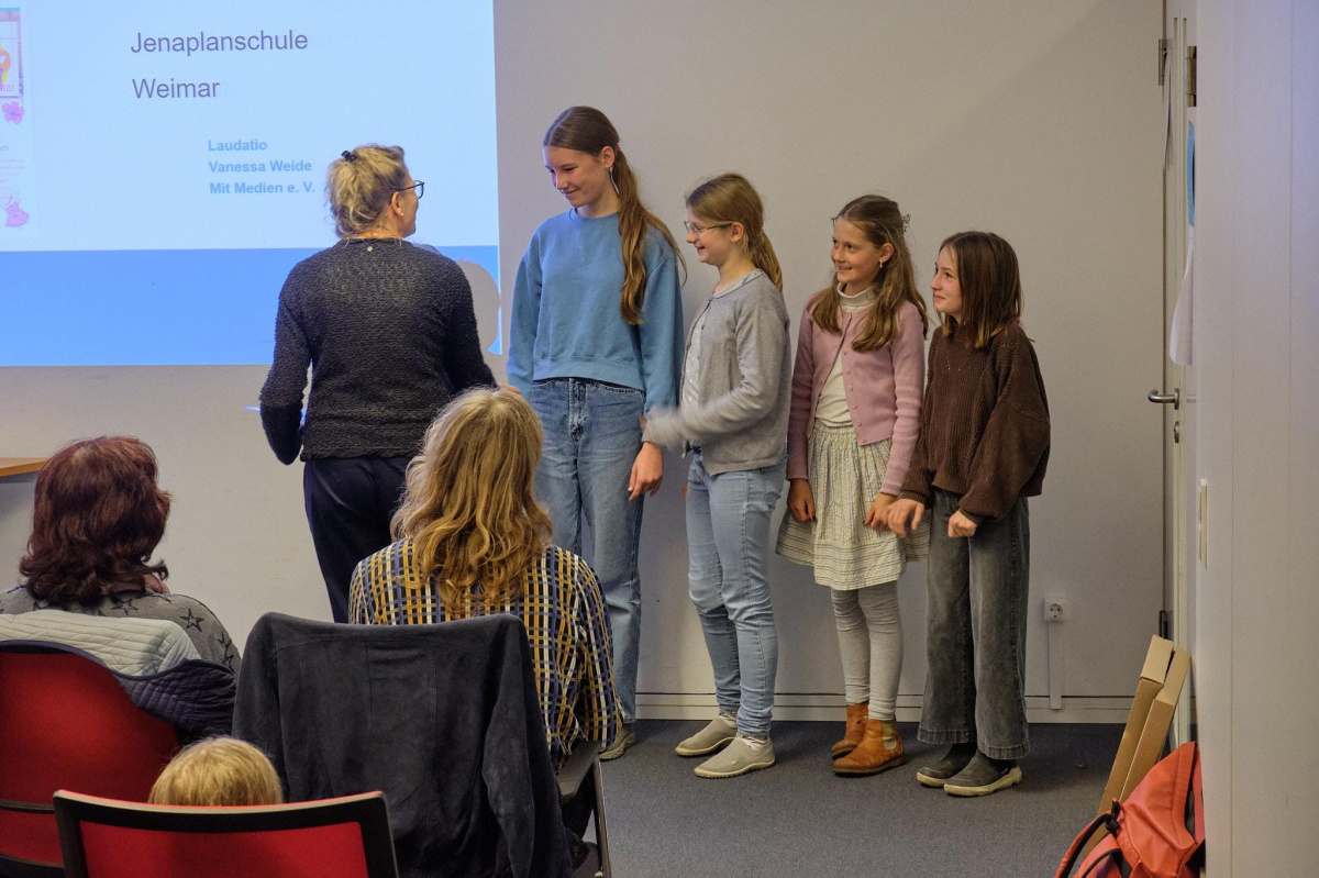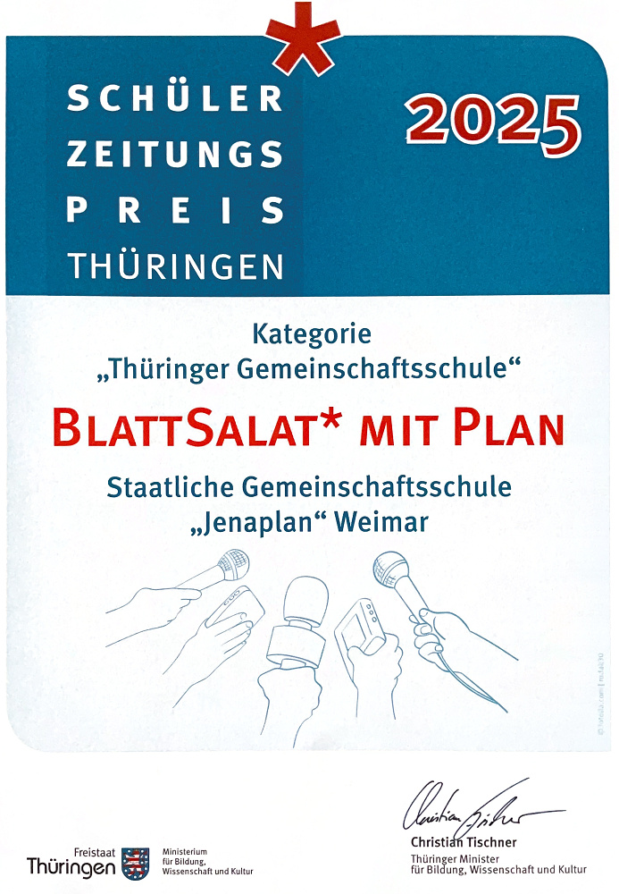 Die BlattSalat hat erneut den Thüringer Schülerzeitungspreis in der Kategorie »Gemeinschaftsschule« gewonnen! Am Donnerstag, den 23.10.25 waren 5 Redakteurinnen ins »Ministerium für Bildung, Wissenschaft und Kultur« nach Erfurt eingeladen, um den Preis entgegen zu nehmen.