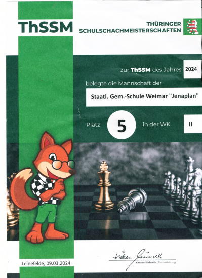 Am 09.03.2024 machten sich Arvin, Niclas, Levin, Friedrich und Yossi, begleitet von Michala auf den Weg nach Leinefelde. Dort fanden die Thüringer Schulschachmeisterschaften statt. Schon auf dem Weg fielen für Aussenstehende schwer nachvollziehbare Buchstaben- und Zahlenkombinationen zwischen den Reisenden. Letzte Tipps wurden geteilt. In der AG und im Verein gut vorbereitet von Mathias traten sie schließlich in den Einzelrunden in der Wettkampfklasse II an. Zwischendurch wurde interessiert, aufgeregt und motivierend geschaut, wie die anderen Teammitglieder spielen, in den Pausen Kuchen, Waffeln oder Bratwurst gegen Marken getauscht. Am Ende wurde es Platz 5. Darauf können unsere 5 Schachspieler aus dem 7. bis 10. Jahrgang durchaus stolz sein!