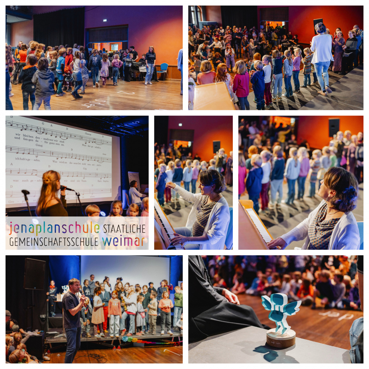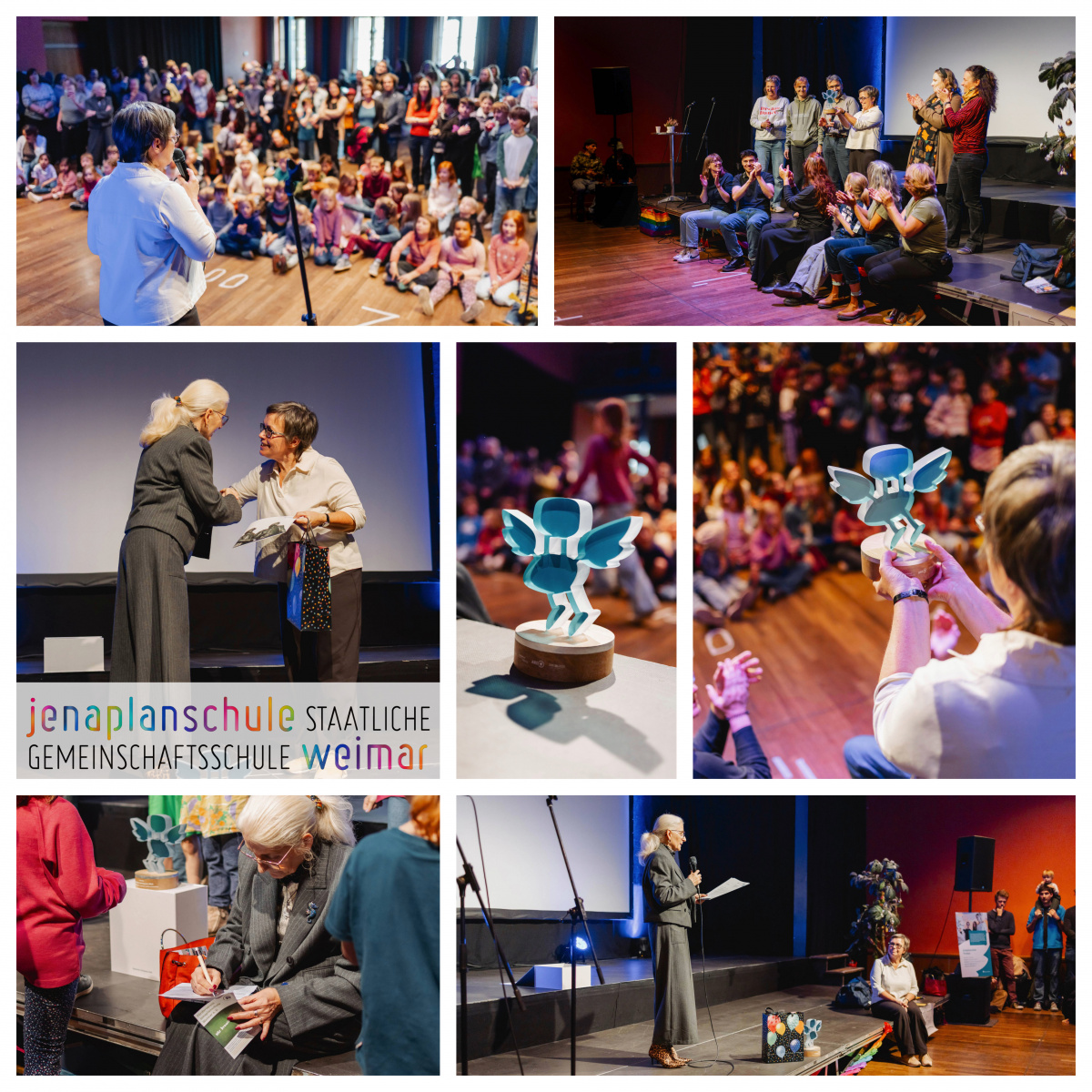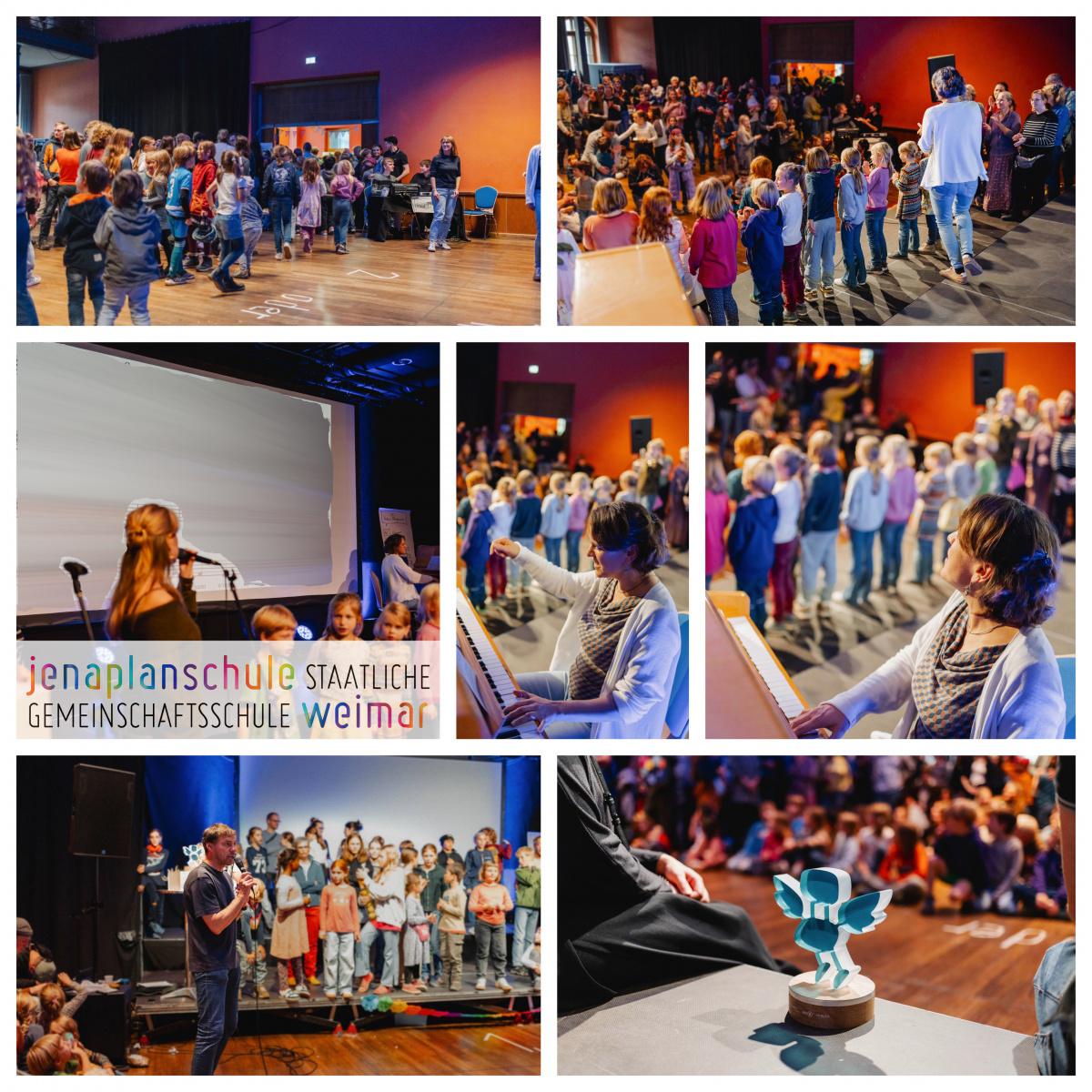Mit großer Unterstützung des Fördervereins wurde vorbereitet und organisiert. Und so gab es, wie fast immer, ein Mitbringbuffet, Getränke vom Förderverein, Musik mit Michala und dem Chor. Tanzende und tobende Kinder und viele Grüppchen von schnatternden Eltern, LehrerInnen und SchülerInnen zeigten das Bild einer bunten Schulgemeinschaft. Alle waren gekommen, um sich in einem von unseren SchülerInnen geschmückten Haus gemeinsam über den Deutschen Schulpreis 2025 zu freuen. Ilka schilderte in ihrer Rede den Bewerbungsprozess und die Preisverleihung in Berlin und würdigte dabei alle Beteiligten. Spielerisch ging es in einem Wettbewerb, in welchem man sein Wissen über die Schule einbringen musste, darum, wer den fliegenden Stuhl als erster in seinem Haus beherbergen darf. Die Vorsitzende des Bildungs- und Sportausschusses, Frau Claudia Hambicke, würdigte die Leistung der Schule durch ihre Anwesenheit und das Verlesen eines Grußwortes des Oberbürgermeisters Peter Kleine. Ella Weyh (11/1) moderierte, für das richtige Licht und die Technik sorgten Axel und Lukas. Allen Beteiligten an der Vorbereitung und Durchführung dieser Feier an dieser Stelle ein herzliches Dankeschön!